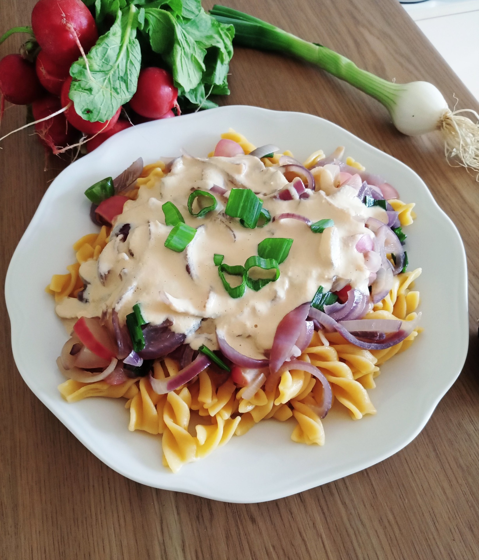 - Na talíř dáme těstoviny, na ně zeleninovou směs a nahoru nalijeme dresing.